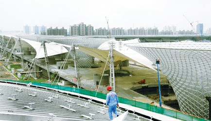 安裝在“陽(yáng)光谷”頂部的索膜結(jié)構(gòu)由69塊巨大的白色膜布拼裝組成,形如藍(lán)天下的朵朵